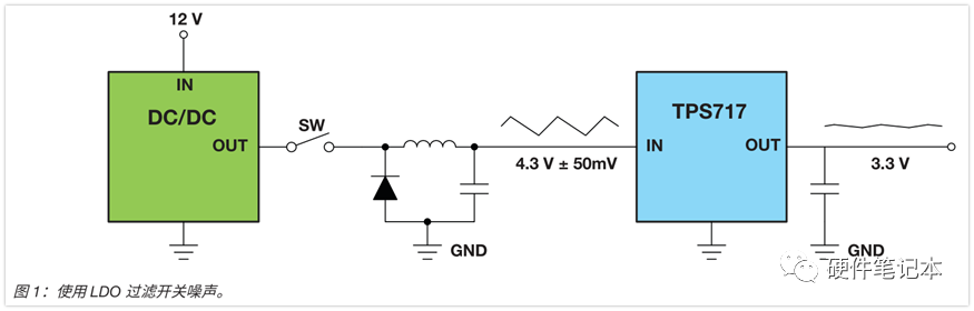 图 1 所示为将 12V 电压轨调节至 4.3V 的直流/直流转换器。后面连接了 TPS717,这是一款 PSRR 值较高的 LDO,用于调节3.3V 电压轨。4.3V 电压轨上因开关生成的纹波为 ±50mV。LDO 的 PSRR 将确定在 TPS717 的输出端剩余的纹波量。