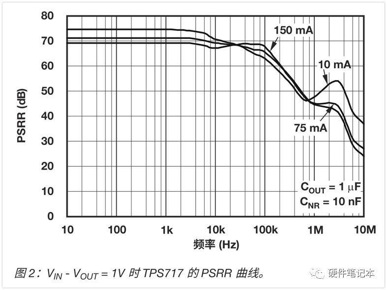 在以下条件下,1MHz 时的 PSRR 指定为 45dB。