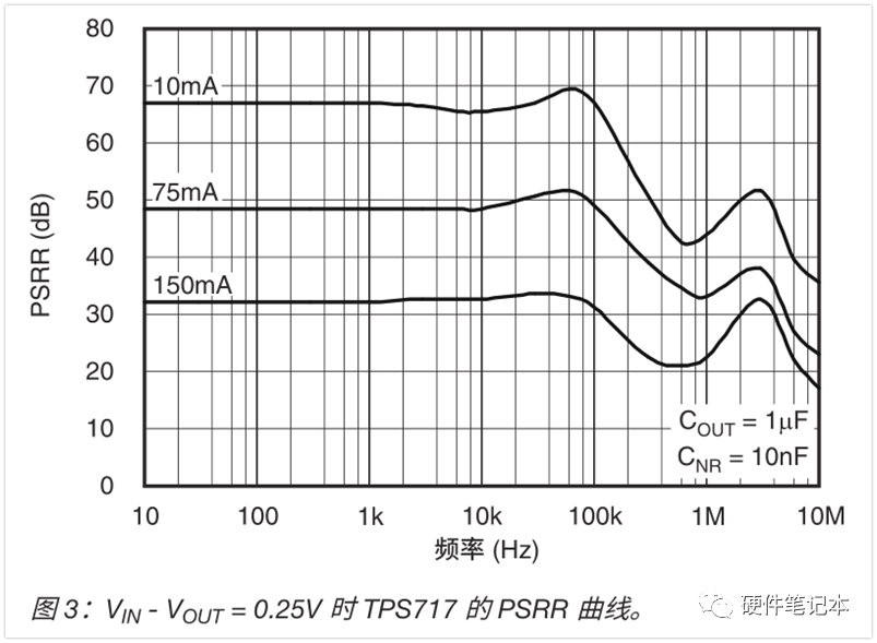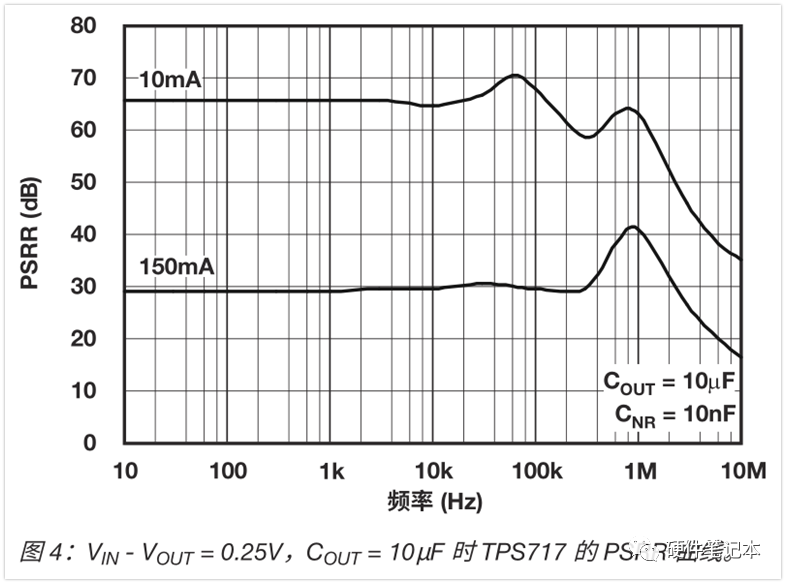 可以看到,如果保持所有其他条件不变,1MHz时的 PSRR 减小到 23dB,即衰减系数为 14。这是因为互补金属氧化物半导体 (CMOS) 导通元件进入三极管(或线性)区,即,随着 VIN -VOUT 的值接近压降电压,PSRR 开始降低。(请记住,压降电压是输出电流及其他因素的函数。因此,较低的输出电流会降低压降电压,有助于提高 PSRR。)