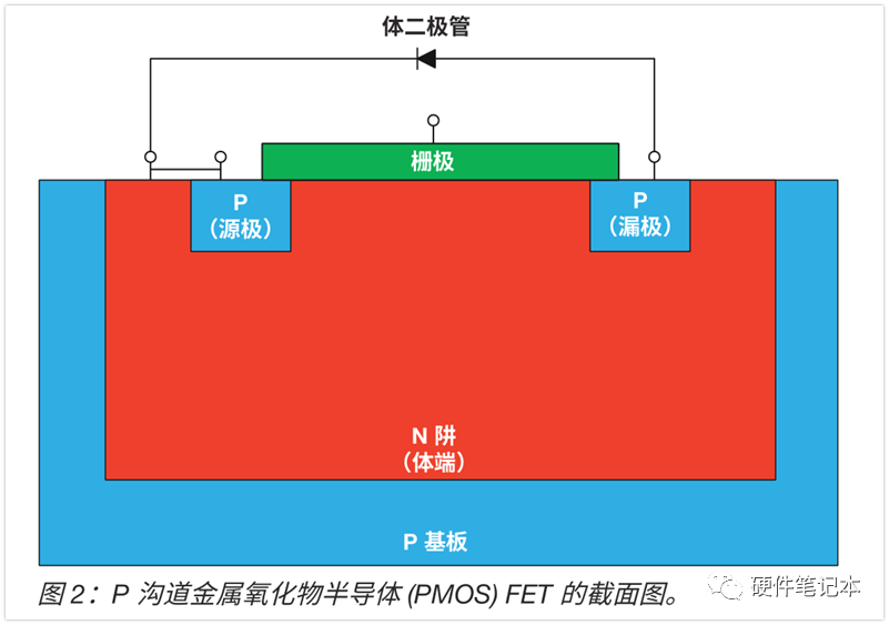 将块体与源极相连有一个缺点,即会在FET 中形成寄生体二极管,如图 2 所示。此寄生二极管被称为体二极管。在这种配置中,当输出超过输入电压与寄生二极管的 VFB 之和时,体二极管将导通。流经该二极管的反向电流可能会使器件温度升高、出现电迁移或闩锁效应,从而导致器件损坏。
