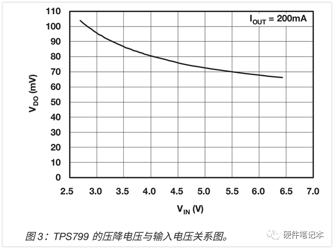 如图 3 所示,TPS799 的压降电压随输入电压(也适用于输出电压)增大而降低。这是因为随着输入电压升高 VGS会负向增大。