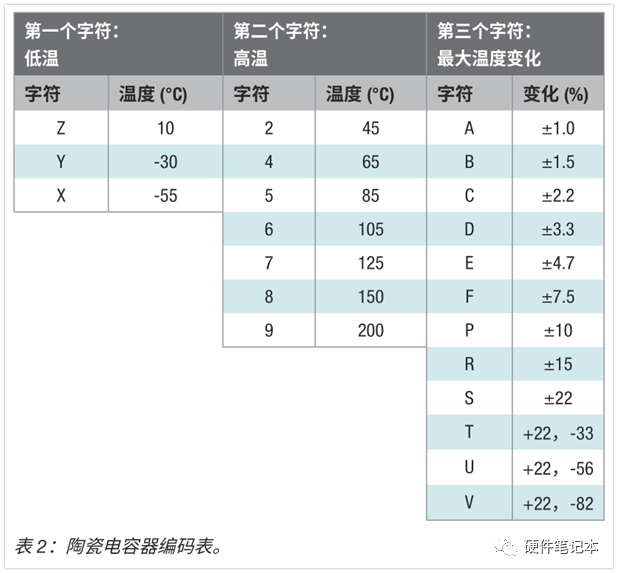 与所有电子器件类似,电容器的额定温度高于其额定性能对应的温度。这种温度降额通常会使电容器的电容低于电容器上标注的数值。表2为电容器温度系数额定值解码表。