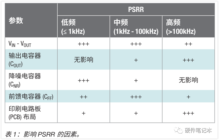仅靠调整 VIN - VOUT 和输出电容,就可以提高特定应用的PSRR。但影响 PSRR 的因素并不仅限于这两项。表 1 概述了对其产生影响的多个因素。