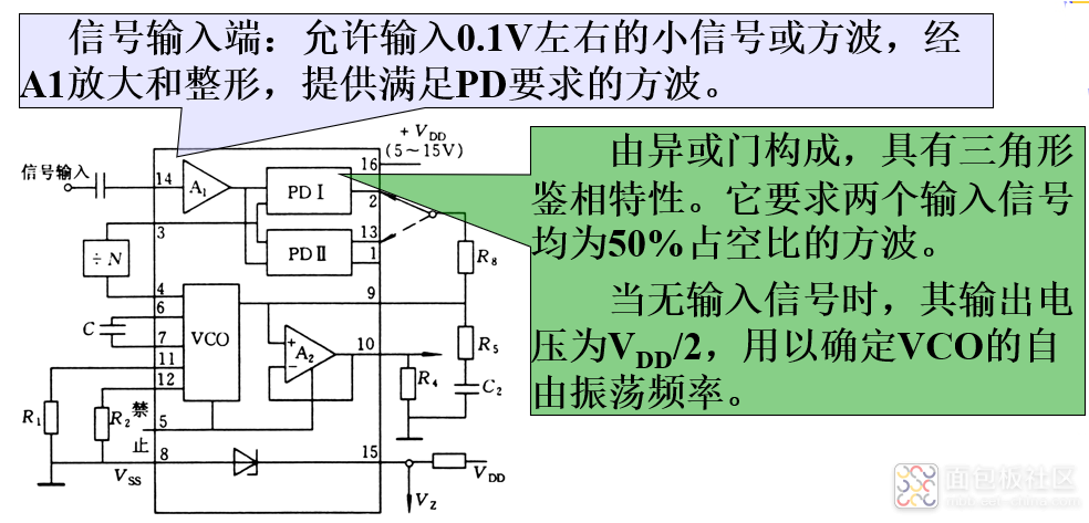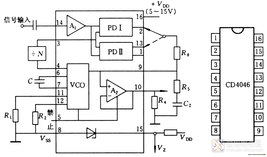 CMOS锁相环路CD4046简介:为数字PLL。内有两个PD、VCO、缓冲放大器、输入信号放大与整形电路、内部稳压器等。具有电源电压范围宽(5~15V)、功耗低、输入阻抗高  等优点。工作频率0~1MHz。内部VCO产生50%占空比的方波。输出电平可与TTL电平或CMOS电平兼容。