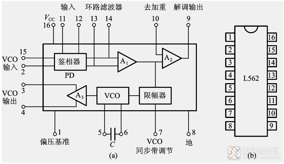 为多功能单片集成PLL。内部除有PD、VCO外,还有三个放大器和一个限幅器。工作频率可达30MHz。