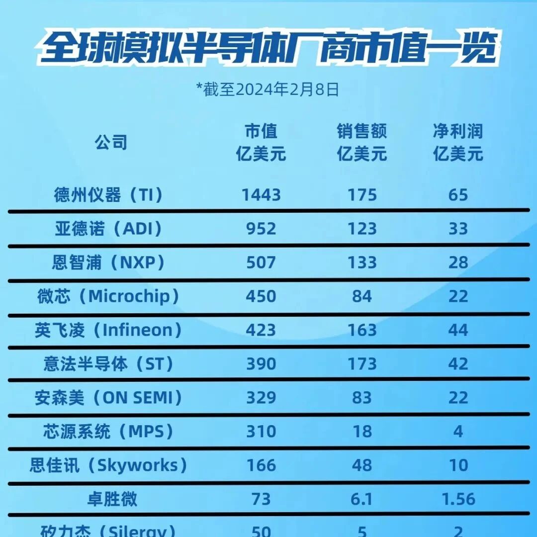 全球模拟半导体厂商市值一览(2024年)声明: 声明:文章来源模拟世界的搬运工。本号对所有原创、转载文章的陈述与观点均保持中立,推送文章仅供读者学习和交流。文章、图片等版权归原作者享有,如有侵权,联系删除。 来源:硬件笔记本