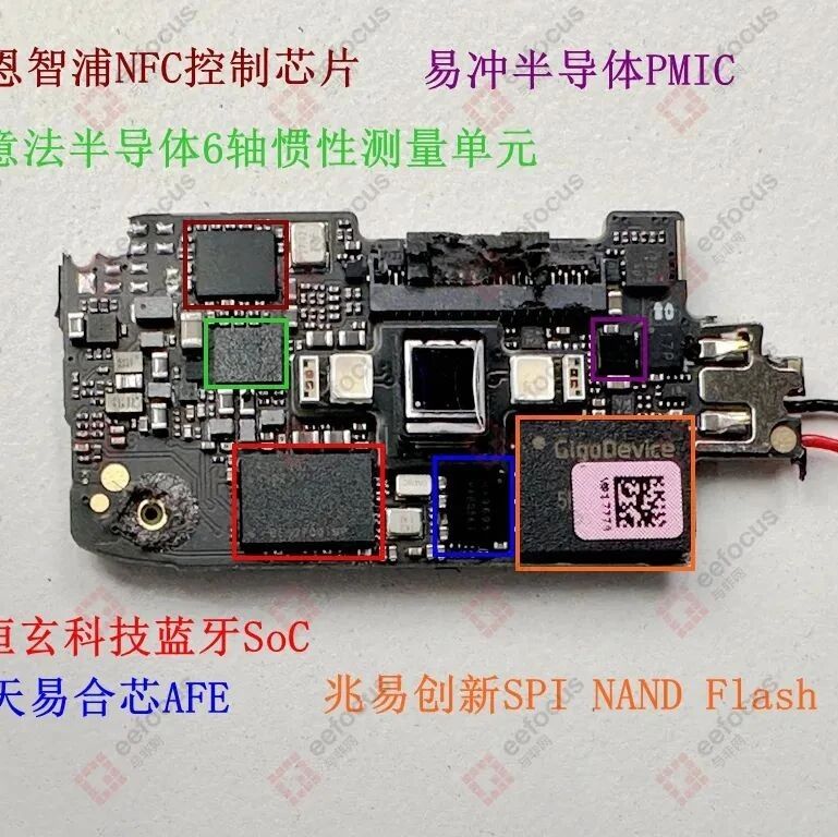 拆解本次拆解的是小米手环9 NFC版本,手环的外观基本没多大变化,重点还是来看下拆解后的硬件方案。从结构来看,主要是由屏幕,结构件的中框和后盖,以及PCB主板和电池组成。 屏幕采用1.62英寸 AMOLED屏,上面覆盖2.5D强化玻璃盖板,最高支持1200nits亮度。屏幕背面FPC电路上带有触摸芯片和环境光传感器,支持全屏触摸操作以及屏幕自动亮度调节。重点看下主板,手环PCB主板的布局就比较紧密了,并且器件基本都布局在一面,另一面则主要是给电池留出放置空间,所以基本没啥芯片,只有一个硅麦克风。电池的额定容量是233mAh,在满足日常功能使用的情况下,可以支持18天左右的续航。 主板上的芯片包括: 小结这就是整个小米手环9的内部结构和硬件方案,从芯片选型来看,和前几代产品相比,芯片的国产化率还是在不断提升。可能再迭代个几代产品,大家就能见到全国产芯方案的小米手环,拭目以待。声明: 声明:文章来源与非网eefocus。本号对所有原创、转载文章的陈述与观点均保持中立,推送文章仅供读者学习和交流。文章、图片等版权归原作者享有,如有侵权,联系删除。 来源:硬件笔记本