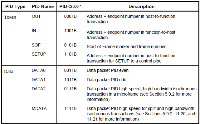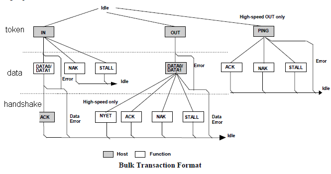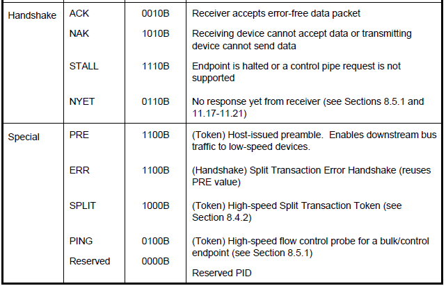 • NAK: 在数据阶段,对于IN事务,它将由device发出;在握手阶段,对于OUT和PING事务,它也将由device发出;host从不发送NAK包。