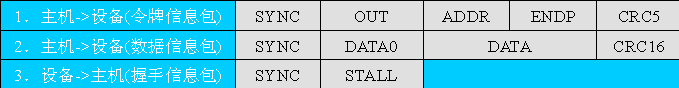 • STALL:指示设备永远停止,需要host软件的干预 (如:设备出错)