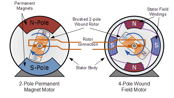 有刷电机–这种类型的电机通过使电流流经换向器和碳刷组件而在绕线转子(旋转的零件)中产生磁场,因此称为“有刷”。定子(静止部分)的磁场是通过使用绕制的定子励磁绕组或永磁体产生的。通常,有刷直流电动机便宜,体积小且易于控制。