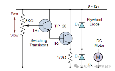 上面的简单开关电路显示了单向(仅一个方向)电动机速度控制电路的电路。由于直流电动机的转速与两端的电压成正比,因此我们可以使用晶体管来调节该端电压。