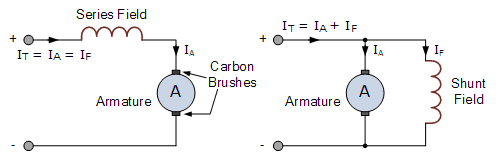 这些形成定子磁场的电磁线圈可以与电动机电枢串联,并联或同时电连接在一起(复合)。串联绕制直流电动机的定子励磁绕组与电枢串联连接。同样,并联绕组直流电动机的定子励磁绕组与电枢并联,如图所示。