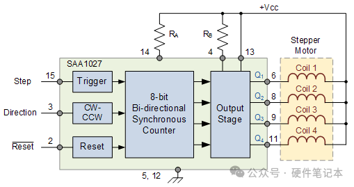 有许多步进电机控制器IC可用,它们可以控制步进速度,旋转速度和电机方向。SAA1027是这样的一种控制器IC,它内置了所有必需的计数器和代码转换功能,并且可以按照正确的顺序自动驱动4个完全受控的桥式输出到电动机。