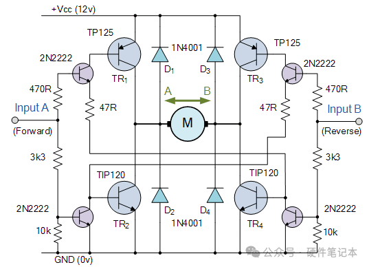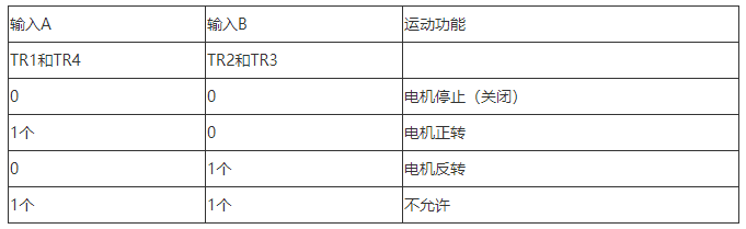 控制输入A在一个方向(正向旋转)上运行电动机,而输入B在另一个方向(即反向旋转)上运行电动机。然后,通过将其“对角线对”中的晶体管切换为“ ON”或“ OFF”,可以实现电动机的方向控制。