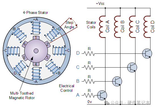 通过依次向每组线圈供电,可以使转子从一个位置旋转或“步进”一个角度,该角度由其步进角度构造确定,并且通过依次激励线圈,转子将产生旋转运动。