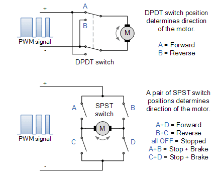 第一个电路使用单个双刀双掷(DPDT)开关来控制电动机连接的极性。通过切换触点,可以将电动机端子的电源反向,并使电动机的方向反向。第二个电路稍微复杂一些,并使用四个以“ H”形配置的单刀单掷(SPST)开关。