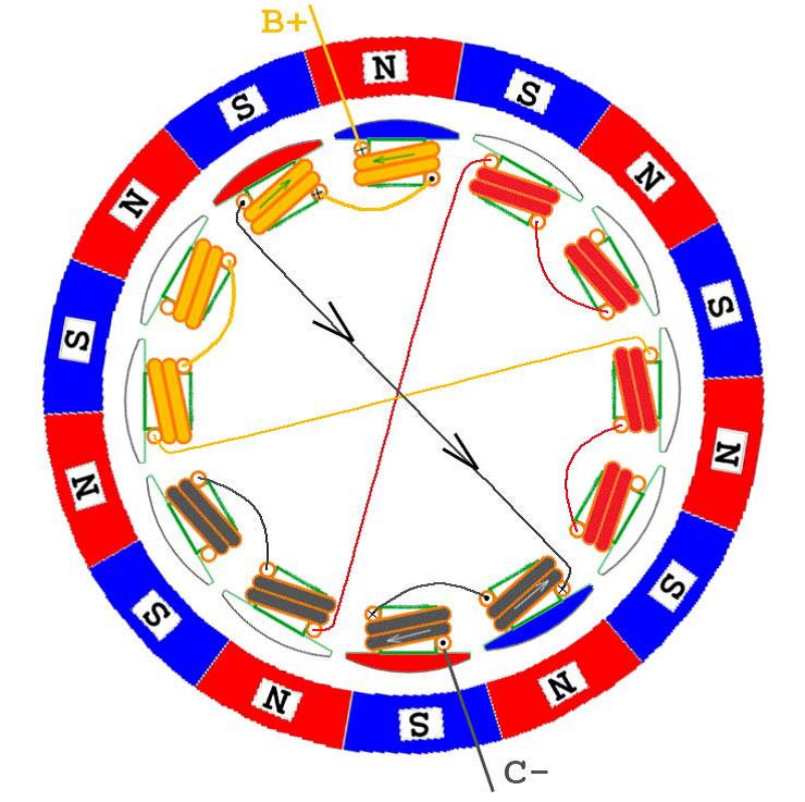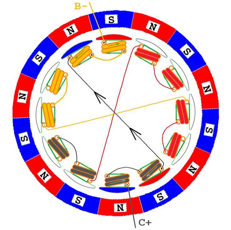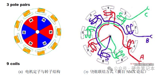 我们再来看一个复杂点的,图(a)是一个三相九绕组六极(三对极)内转子电机,它的绕组连线方式见图 (b)。从图(b)可见,其三相绕组也是在中间点连接在一起的,也属于星形联结方式。一般而言,电机的绕组数量都和永磁极的数量是不一致的(比如用9绕组6极,而不是6绕组6极),这样是为了防止定子的齿与转子的磁钢相吸对齐。