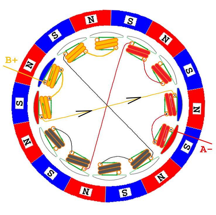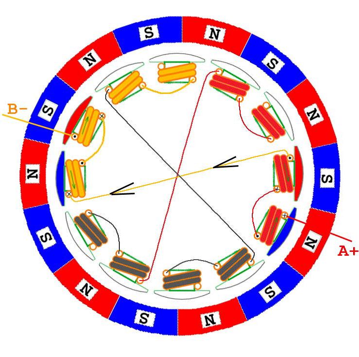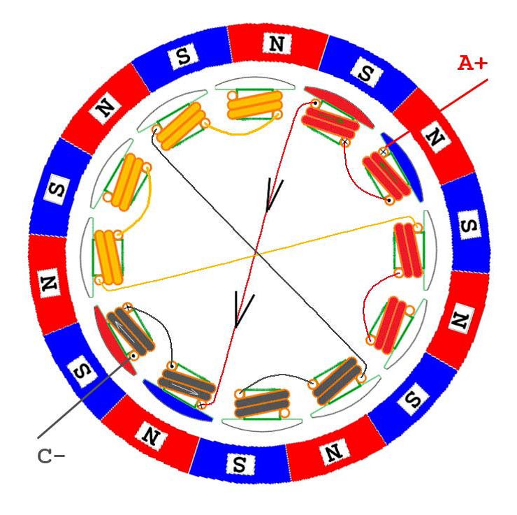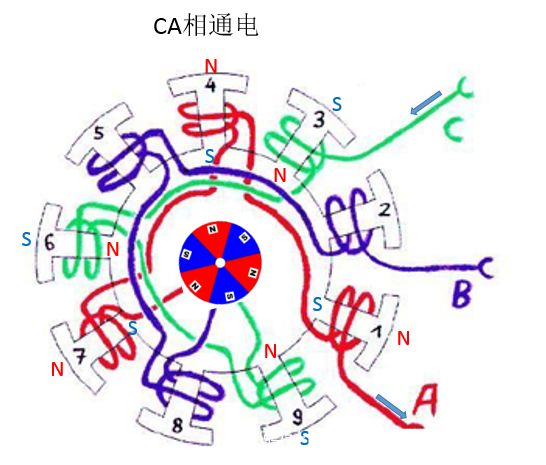上图显示了定子绕组的联结方式(转子未画出假想是个二极磁铁),三个绕组通过中心的连接点以“Y”型的方式被联结在一起。整个电机就引出三根线A,B, C。当它们之间两两通电时,有6种情况,分别是AB, AC, BC, BA, CA,CB注意这是有顺序的。