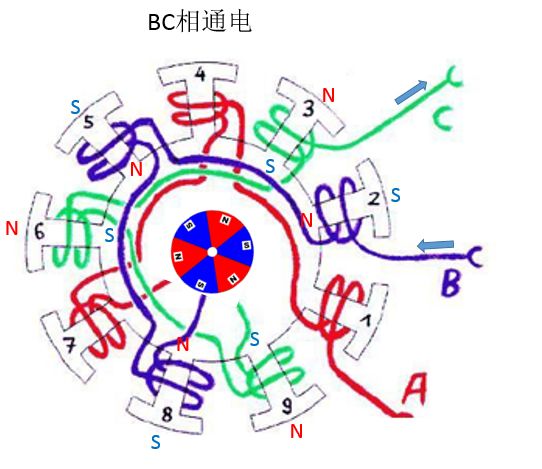 要说明一下的是,由于每根引出线同时接入两个绕组,所以电流是分两路走的。这里为使问题尽量简单化,下面几个图中只画出了主要一路的电流方向,还有一路电流未画出,另一路电流的具体情况放在后面进行分析,涉及到电路检测换相位置。