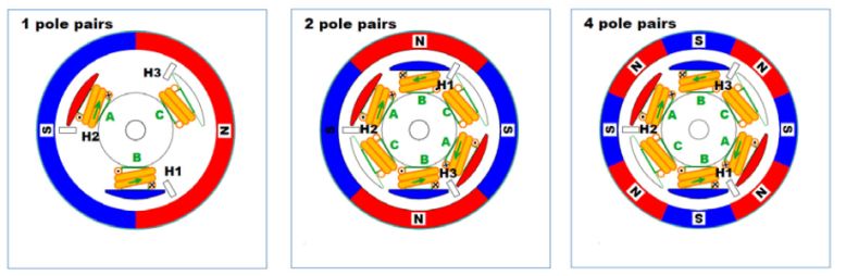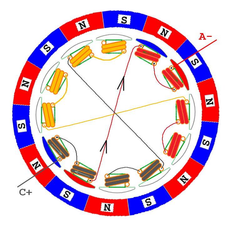后面画出了6种两相通电的情形,可以看出,尽管绕组和磁极的数量可以有许多种变化,但从电调控制的角度看,其通电次序其实是相同的,也就是说,不管外转子还是内转子电机,都遵循AB->AC->BC->BA->CA->CB的顺序进行通电换相。