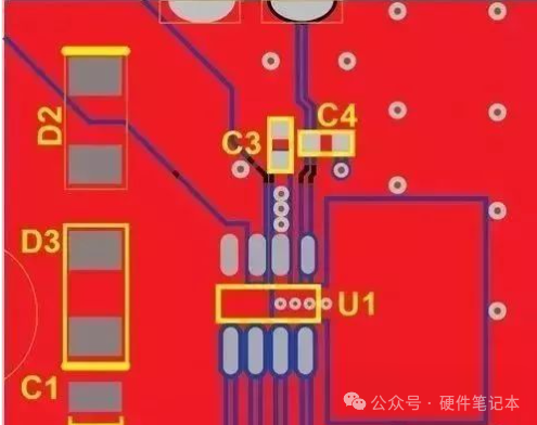 如下图所示为“倒装芯片引线框架”SOIC 封装的典型 PCB 布局。引脚 2 为器件电源引脚。请注意,铜区域置于顶层器件的附近,同时几个热通孔将该区域连接至 PCB 背面的铜层。引脚 4 为接地引脚,并连接至表层的接地覆铜区。引脚 3(器件输出)也被路由至较大的铜区域。