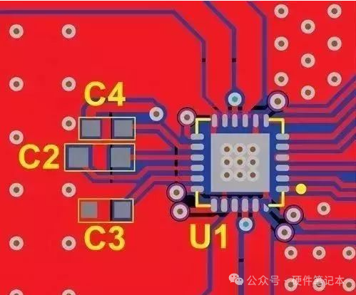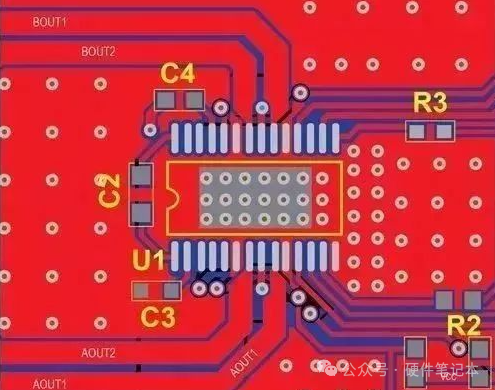 QFN 器件封装边缘四周的板避免在顶部使用铜层吸收热量。必须使用热通孔将热量驱散至内层或 PCB 的底层。