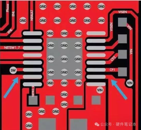 通过将较大的铜区域连接至承载较大电流的引线,可优化热性能。在电机驱动器 IC 上,通常电源、接地和输出引脚均连接至铜区域。