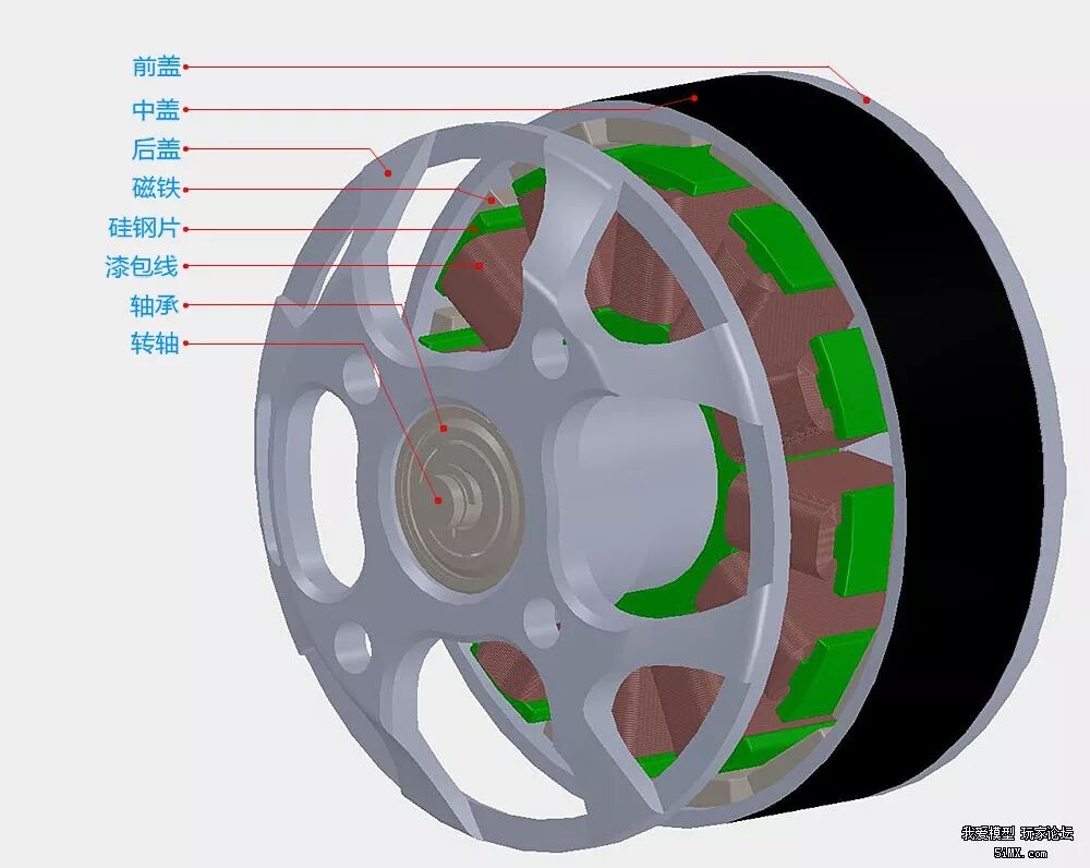 无刷电机的前盖、中壳、后盖主要是整体结构件,起到构建电机整体结构的作用。但是外转子无刷电机的外壳同时也是磁铁的磁路通路,所以外壳必须是导磁性的物质构成。内转子的外壳只是结构件,所以不限定材质。但是内转子电机比外转子电机多一个转子铁芯,这个转子铁芯的作用同样也是起到磁路通路的作用。