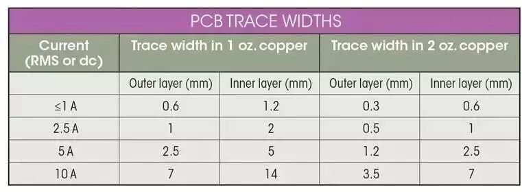 作为一个大致的指导方针,下表显示了电机驱动器应用中较长走线(超过大约 2 cm)的建议走线宽度。
