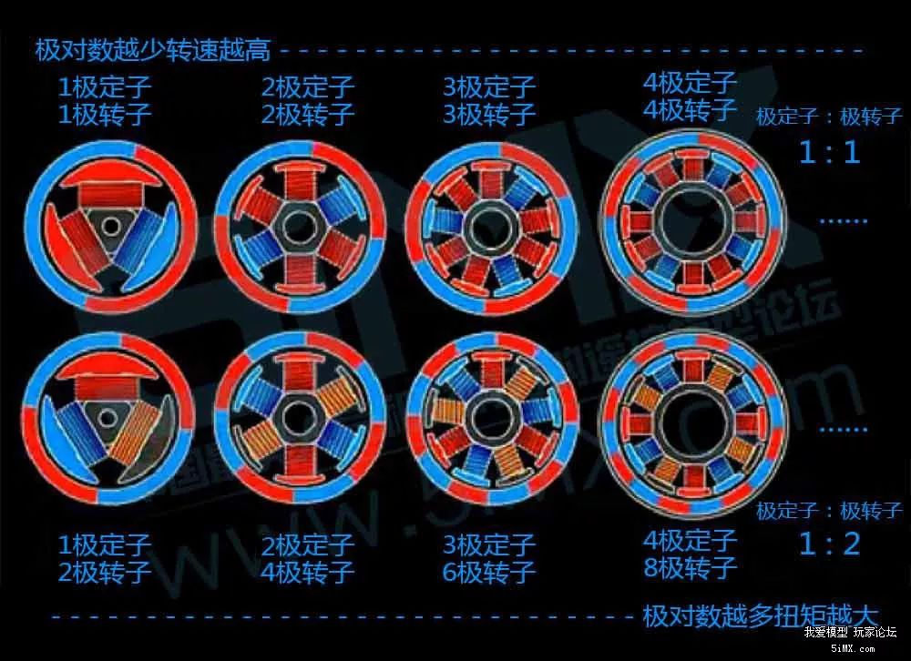 简单而言,直流无刷电机就是依靠改变输入到无刷电机定子线圈上的电流波交变频率和波形,在绕组线圈周围形成一个绕电机几何轴心全转的磁场,这个磁场驱动转子上的永磁磁钢转动,电机就转起来了,电机的性能和磁钢数量、磁钢磁通强度、电机输入电压大小等因素有关,更与无刷电机的控制性能有很大关系,因为输入的是直流电,电流需要电子调速器将其变成3相交流电,还需要从遥控器接收机那里接收控制信号,控制电机的转速,以满足模型使用需要。