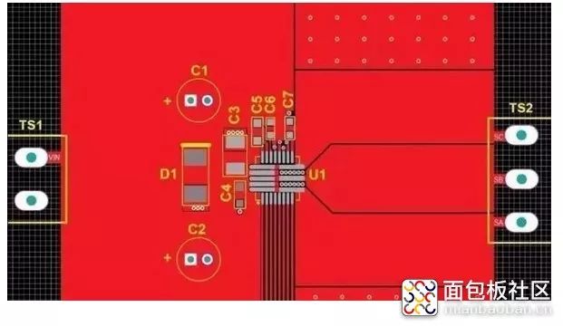 器件左侧的铜区域为功率输入口。这个较大的铜区域直接连接至器件的两个电源板。