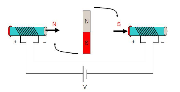 当两头的线圈通上电流时,根据右手螺旋定则,会产生方向指向右的外加磁感应强度B(如粗箭头方向所示),而中间的转子会尽量使自己内部的磁感线方向与外磁感线方向保持一致,以形成一个最短闭合磁力线回路,这样内转子就会按顺时针方向旋转了。