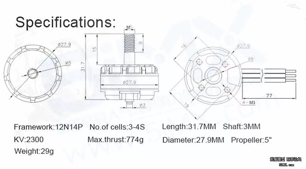 同系列同外形尺寸的无刷电机,根据绕线匝数的多少,会表现出不同的KV特性。绕线匝数多的,KV值低,最高输出电流小,扭力大;绕线匝数少的,KV值高,最高输出电流大,扭力小。我先前测试过穿越机2204电机的极限电流,单电机能彪上25A,而2212系列电机15A都上不了。