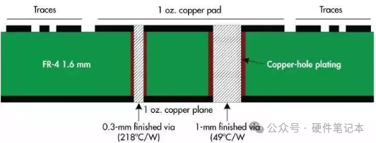 通孔具有热阻,这意味着当热量流过通孔时,通孔之间会出现一些温降,测量单位为℃/W。为使这一热阻降至最低,并提高通孔传输热量时的效率,应使用大通孔,且孔内应含有尽可能多的铜面积。