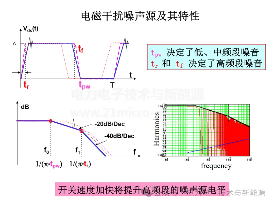 目录:1.三极管是什么?2.三极管工作原理3.三种状态4.输入输出特性曲线5.三极管的主要参数(选型指导)6.应用1.三极管是什么?三极管,全称应为半导体三极管,也称双极型晶体管、晶体三极管,是一种控制电流的半导体器件。其作用是把微弱信号放大成幅度值较大的电信号,也用作无触点开关。三极管是在一块半导体基片上制作两个相距很近的PN结,两个PN结把整块半导体分成三部分,中间部分是基区,两侧部分是发射区和集电区,排列方式有PNP和NPN两种。2.三极管工作原理晶体三极管(以下简称三极管)按材料分有两种:锗管和硅管。而每一种又有NPN和PNP两种结构形式,但使用最多的是硅NPN和锗PNP两种三极管,(其中,N是负极的意思(代表英文中Negative),N型半导体在高纯度硅中加入磷取代一些硅原子,在电压刺 激下产生自由电子导电,而P是正极的意思(Positive)是加入硼取代硅,产生大量空穴利于导电)。具体电子是如何运动的,忽略。在运用时,只需要把三极管的电流放大作用类比成一个阀门即可。3.三种状态(1)截止状态当加在三极管发射结的电压小于PN结的导通电压,基极电流为零,集电极电流和发射极电流都为零,三极管这时失去了电流放大作用,集电极和发射极之间相当于开关的断开状态,我们称三极管处于截止状态。(2)放大状态当加在三极管发射结的电压大于PN结的导通电压,并处于某一恰当的值时,三极管的发射结正向偏置,集电结反向偏置,这时基极电流对集电极电流起着控制作用,使三极管具有电流放大作用,其电流放大倍数β=ΔIc/ΔIb,这时三极管处放大状态。(3)饱和状态当加在三极管发射结的电压大于PN结的导通电压,并当基极电流增大到一定程度时,集电极电流不再随着基极电流的增大而增大,而是处于某一定值附近不怎么变化,这时三极管失去电流放大作用,集电极与发射极之间的电压很小,集电极和发射极之间相当于开关的导通状态。三极管的这种状态我们称之为饱和导通状态。4.输入输出特性曲线三极管特性曲线是反映三极管各电极电压和电流之间相互关系的曲线,是用来描述晶体三极管工作特性曲线,常用的特性曲线有输入特性曲线和输出特性曲线。这里以下图所示的共发射极电路来分析三极管的特性曲线。(1)输入特性曲线该曲线表示当e极与c极之间的电压Uec保持不变时,输入电流(即基极电流Ib)和输入电压(即基极与发射极间电压Ube)之间的关系曲线,如下图所示:一般状况下,当UCE≥1V时,集电结就处于反向偏置,此刻再增大UCE对iB的影响很小,也即UCE>1V往后的输入特性与UCE=1V的一条特性曲线重合,所以,半导体器材手册中一般只给出一条UCE≥1V时的输入特性曲线,如图所示。输入特性曲线的数学表达式为:iB=f(uBE)| UCE = 常数(2)输出特性曲线输出特性是指以基极电流IB为常数,输出电压uCE和输出电流iC之间的曲线,即:iC=f(uCE)|IB =常数。1、在放大区,集电极电流ic恒等于基极电流ib的倍,与电压uce无关。2、在饱和区,集电极电流ic会跟随着uce电压的增大而增大,近似为线性;放大区和饱和区的界限是三极管的饱和电压uces,当uce>uces时候便是放大区,该饱和电压还与基极电流ib成正比。3、截止区,当ib=0的时候,三极管关断,几乎无电流的流进与流出,常常使用时该状态做电子开关使用。如何快速区分放大区和饱和区?(这个我常常记不住)——答案就是,在放大区,集电极电流ic恒等于基极电流ib的倍数,与电压uce无关,即此时Ic是一条横线。5.三极管的主要参数(选型指导)1、电流放大系数(也叫电流放大倍数)分直流和交流放大系数直流也叫做静态电流放大系数,是在静态无变化信号输入时,晶体管集电极电流IC与基极电流IB的比值,一般用HFE或β表示。交流也叫动态电流放大系数,指在交流状态下的HFE或β;2、耗散功率也叫集电极最大允许耗散功率PCM,是晶体管参数变化不超过规定允许值时的最大集电极耗散功率。它与晶体管的最高允许结温和集电极最大电流有密切关系,晶体管使用时,其实际耗散功率不允许超过PCM值,否则会造成晶体管因过载而损坏。PCM小于1W的叫小功率晶体管,1W<PCM<5W的叫中功率晶体管,大于5W的是大功率晶体管。3、频率特性晶体管的放大系数和工作频率有关,如果超过了工作频率,则会出现放大能力减弱甚至失去放大作用。晶体管的频率特性主要包括特征频率FT和最高振荡频率FM等。特征频率:当f= fT时,三极管完全失去电流放大功能.如果工作频率大于fT,电路将不正常工作。fT称作增益带宽积,即fT=βfo。若已知当前三极管的工作频率fo以及高频电流放大倍数,便可得出特征频率fT。随着工作频率的升高,放大倍数会下降.fT也可以定义为β=1时的频率。小于或者等于3MHZ是低频管,大于或等于30MHZ是高频管,大于3MHZ小于30MHZ是中频管。最高振荡频率FM,只晶体管的功率增益降为1时所对应的频率,通常高频晶体管的最高振荡频率低于共基极截止频率Fa,而特征频率FT则高于共基极截止频率Fa,低于共集电极截止频率Fβ。4、集电极最大电流Icm是晶体管集电极所允许通过的最大电流,当晶体管的集电极电流IC超过ICM时,晶体管的β值等参数将发生明显变化,影响其正常工作,甚至损坏。5、最大反向电压指晶体管在工作时允许施加的最高工作电压,它包括集电极-发射极反向击穿电压、集电极-基极反向击穿电压和发射极-基极反向击穿电压。集电极-发射极反向击穿电压指晶体管基极开路时,集