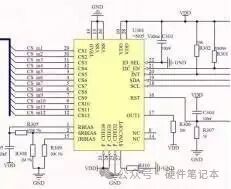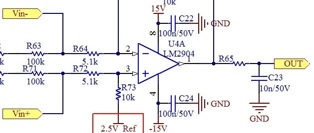 差分运算放大电路,对共模信号得到有效抑制,而只对差分信号进行放大,因而得到广泛的应用。 差分电路的电路构型 图1:差分电路目标处理电压:是采集处理电压,比如在系统中像母线电压的采集处理,还有像交流电压的采集处理等。差分同相/反相分压电阻:为了得到适合运放处理的电压,需要将高压信号进行分压处理,如图1中V1与V2两端的电压经过分压处理,最终得到适合运放处理的电压Vin+与Vin-。 差分放大电路 反馈,对于运算放大电路来说,运放工作在线性区,所以这里一定是负反馈,没有反馈(开环)或者是正反馈,那是比较器电路而不是放大电路,这时候运放工作在饱和区或称为非线性工作区,正因为饱和,输出才是电源电压的幅值。图2是一种带正反馈的运放电路,这里就不能叫运算放大电路了,因为运放的开环放大倍数理想是无限大,当然实际中不可能无限大,所以如下结构是迟滞电压比较器,运放工作在非线性区或饱和区。图2图3,依然是电压比较器结构,上面已经提到,运放开环增益很大,不带负反馈,工作就如非线性区,当做电压比较器来使用。图3运算放大器,反馈电阻从输出接到反相端"-"就是负反馈,当然在输出信号不超过电源电压时(注:一切信号的能量来源是电源,输出当然不可能超过电源幅值),实现的功能就是放大信号的功能;接到同相端"+"就是正反馈,电路功能是电压比较器。当然在实际当中我们并不提倡用运放去做电压比较器,而是选用专用的比较器,如LM339、LM393、LM211等,因为比较器和运放在实际当中内部器件的工作状态还是有区别的。比较器接了限流电阻—"R74、R77",这是因为比较器在幅值切换时,快速上升或下降沿对后级容性负载进行充放电,这个充放电电流确来自这个有源器件—比较器,因此加限流电阻目的是防止电流冲击。RC滤波:可以酌情调节,目的是防止输出过冲等信号失真问题。 差分输入电压的计算 图4电路,为了便于计算,我们给定每个阻值。差分电路的另一个特点是对称性,R40=R56及R47=R55,差分分压两个支路电阻也是相等的。图4Vin+和Vin-的值是如何计算的?我们先通过繁琐的计算来得到,然后再简化计算。首先,运放的同相端5引脚和反相端6引脚,利用"虚短"得到,其中系数6是指6个100k的电阻,方便简化式子:那么通过分压关系得到Vin+:再次通过分压关系得到Vin-:由此可以得到Vin+减Vin-的值。其实还有一种简单方法得到Vin+减Vin-的值,利用运放的虚短特点,可将电路等效为:图5图6所以,要计算Vin+减Vin-的值,变得很容易,只是一个简单的分压电路而已,如下计算得到:得到差分电压输入值是0.84V。 差分放大电路的计算 图7计算公式推导,依旧遵循运放的虚短和虚断特性,当R56=R40,R47=R55时,差分计算可以简化为:实际应用电路中,我们为了简化计算,也是用最简方法计算,经常使用的电路也是上述电路,令电阻相等关系,简化计算。 放大电路的"偏移计算" 为什么要对输出电压进行偏移?这是因为如当采集负值时,我们的采样芯片和MCU几乎都不支持负值采样的时候,你就必须进行偏移,使得输出总是为正值。偏移电路,如图8,在原来同相端电阻接地GND的地方,我们接一个电压值,通常也称为偏移电压。那么最终表达式是什么?图8通过叠加定理最终得到:这里公式的成立,保证R64=R72,R73=R57,那么最终得到偏移公式是在原来基础上加个电压偏移量2.5V_Ref:只要根据实际应用选择合适的偏移量,输出总会为一个正值。图9比如,图9电路,输入电压变为-100V,那么最终输出电压就为:这样就将负电压偏移为正电压,处理器符合处理器处理要求了,偏移电路在采集如交流电、以及存在负直流电压的控制电路中广泛使用。 声明: 声明:文章来源网络。本号对所有原创、转载文章的陈述与观点均保持中立,推送文章仅供读者学习和交流。文章、图片等版权归原作者享有,如有侵权,联系删除。 来源:硬件笔记本