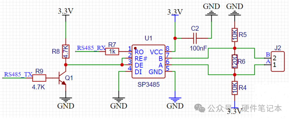 自动收发电路相比较普通的485电路,区别在于多一个晶体管控制485的使能引脚。R9限流电阻一般是4.7K,R8上拉电阻一般也是4.7K,使能引脚在晶体管没有导通时被上拉。