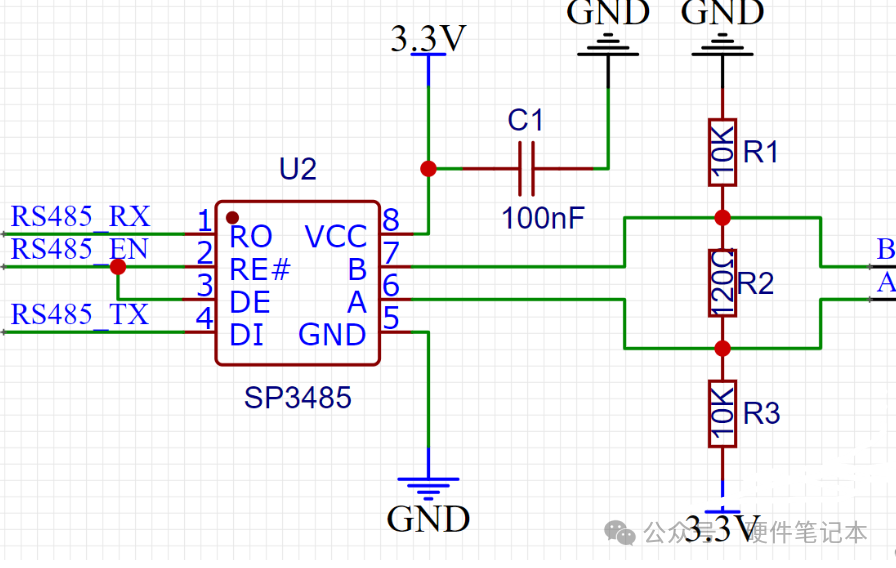 RS485电路设计可以分为隔离型和非隔离型,下图是非隔离型电路,B端接到GND下拉,A端通过上拉电阻为高电平,是为了保证A和B之间的压差大于200mV。DE和RE引脚是发送和接收使能,RE为低时,为接收使能;DE为高时,是发送使能。应用中一般是两者连接在一起,通过IO口(RS485_EN)控制,因为芯片要么是处于接收,要么处于发送,因此在发送数据前,给RS485_EN信号为高电平,接收数据就给低电平。
