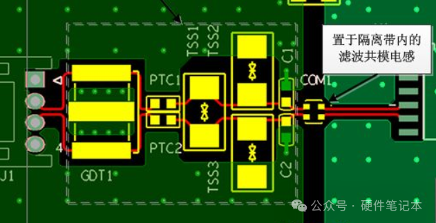 虚线处的防护器件要尽量靠近接口,摆放紧凑整齐,先放防护器件再放滤波器件。