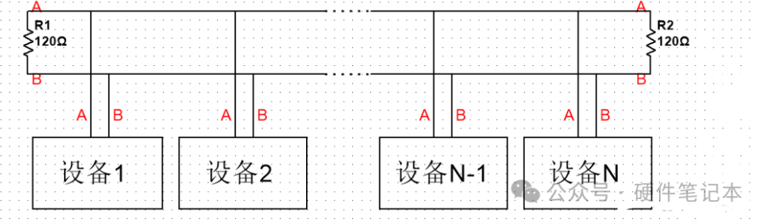 RS485是半双工通信,半双工通信指的是通道在一个时刻只能处于接收或者是发送。RS485的特点是支持多节点传输、传输距离远、抗干扰能力强,RS485可以连接多个485设备,信号的速率可达到10Mbps。通过AB两线之间的压差来判断是逻辑电平1或者逻辑电平0,当AB间的电压差大于200mV时为高电平1,小于200mV时为逻辑电平0。一般会在首末两端接120Ω电阻,其作用是进行阻抗匹配,消除信号反射。
