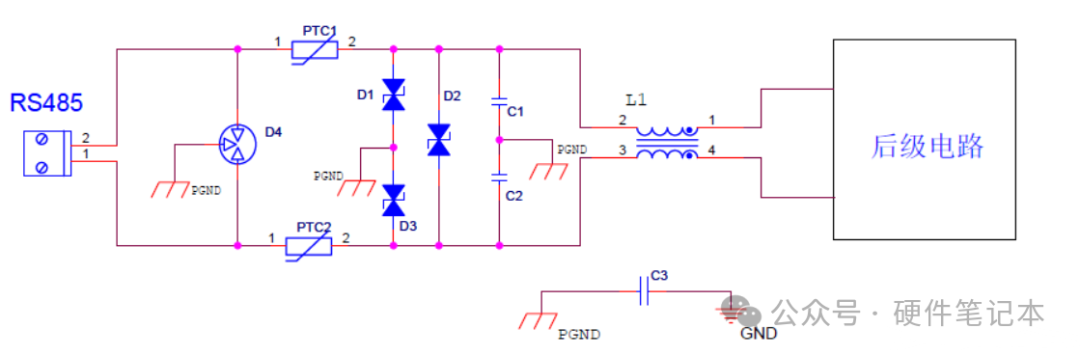 L1是共模电感,共模电感衰减共模噪声,增强抗干扰能力,一般选择120Ω/100MHz。C3电容的作用是为了隔开接口地和数字地,一般选择1000pF。为了达到EMC防护要求,差模信号2kV,共模信号6kV,在接口处会预留上气体放电管、热敏电阻、TVS管组成防护电路。