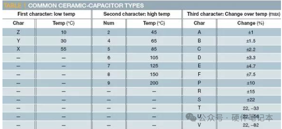 表1给出了用于不同种类瓷片电容的字母与数字,以及它们各自的含义。表格描述了Class II和Class III两种瓷片电容。这里不谈太多细节,Class I级电容包括常见的COG(NPO)型;这种电容的体积效率不及表格中的两种电容,但是它在多变环境条件下要稳定得多,而且不会出现压电效应。相反,表格中的电容具有广泛多变的特性,它们能够扩展并承受所施加的电压,但有时会产生可听到的压电效应(蜂鸣声或振铃 声)。