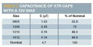从图中可以看出,表2显示了X7R电容在12V偏压货款,电容量的减少量。注意,随着电容封装尺寸逐步增加到1210,电容量有着稳步的增长,但是超过这个尺寸就没有多大改变了。