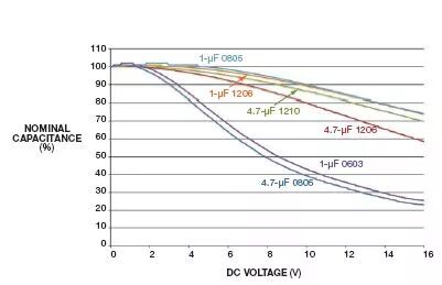 在我的例子中,我为4.7μF的X7R电容选择了最小的可用封装,因为尺寸是我项目的一个考虑因素。由于本人的无知,因而假设了任何一种X7R都与其它X7R有相同的效果;而显然,情况并非如此。为使我的应用得到正确的性能,我必须采用某种更大的封装。