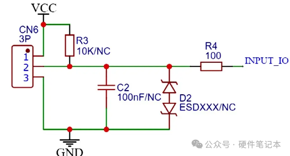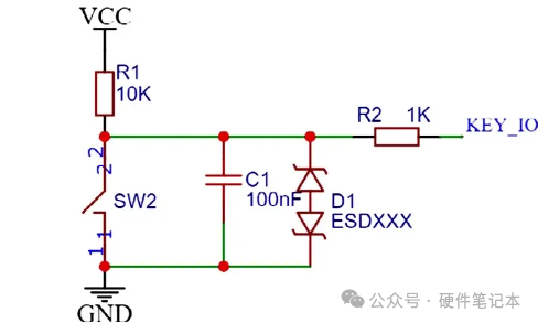 3、R2限流电阻(取值100欧~10k不等,如果有设置内部上拉,该值不能太大,否则电流不足以拉低IO口) 保护IO口 防止过流过高电压烧坏IO口,对静电或者一些高压脉冲有吸收作用。(个人建议加上)