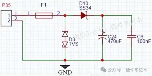 2、D10 肖基特二极管 减少后级电源对前级的影响,防止电源正负接反烧坏后级电路,防止电源关电时电流倒灌,但经过二极管有0.4V左右压降,需要考虑经过0.4V降压后会不会低于后级电路的正常工作电压
