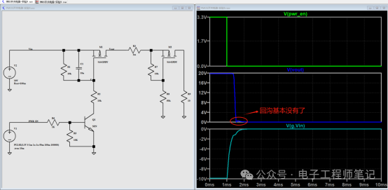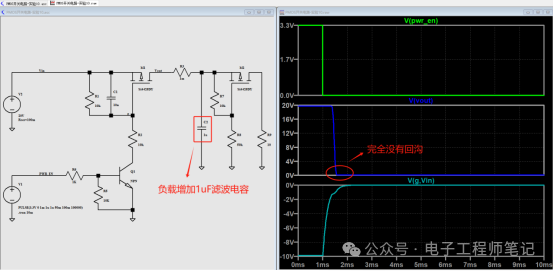 以上为PMOS开关仿真电路,其将负载换成了一个开关电路,在改变负载以后,Vout的下电波形就不正常了,这是为什么呢?