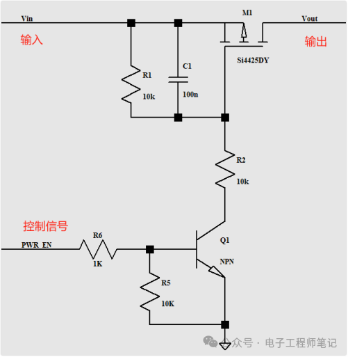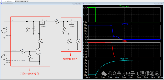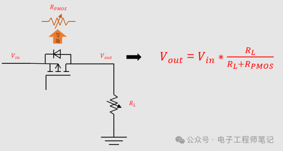 PMOS从导通到关断时,PMOS的阻抗会从接近0(导通),再到电阻无穷大(断开),这里会有一段过程,而PMOS会存在一定的阻值,负载也非恒定电阻。