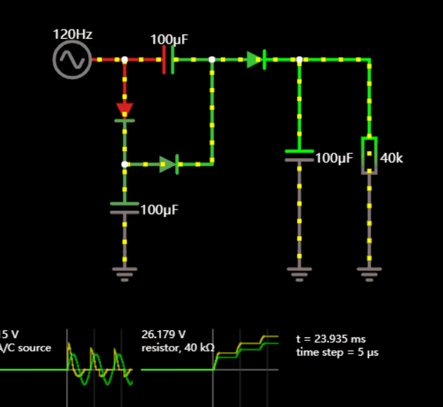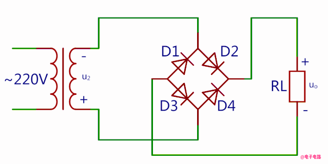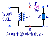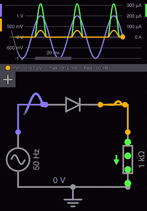 通过一个二极管实现半波整流。其中1kΩ的电阻是负载。半波整流电路,即把“交流电压”转变为“脉动直流电压“。所谓“脉动直流电压“,是指电压方向(正负极)不变,但大小随时间变化。各点波形如下: