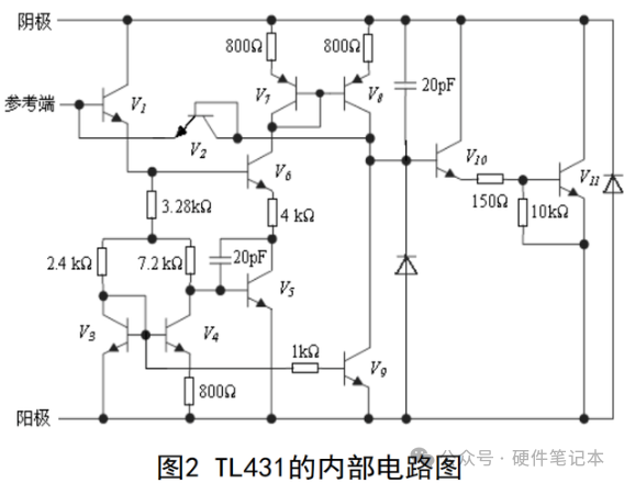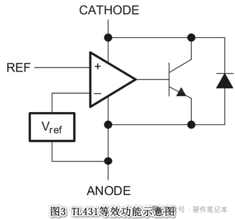 如其等效功能示意图如图3所示,由一个2.5V的精密基准电压源、一个电压比较器和一输出开关管等组成,参考端的输出电压与精密基准电压源Vref相比较,当参考端电压超过2.5V时,TL431立即导通。